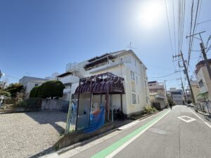 落ち着いた雰囲気の外観で、周辺は住宅が中心の静かなエリアです。
